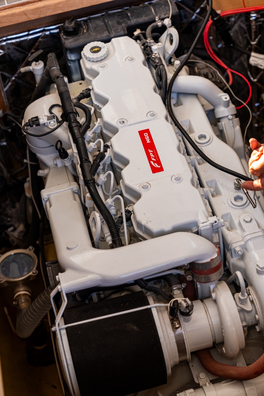Il Vano motori ampio e spazioso imbarca due FNM modello 42 da 2 x 350 HP che consentono alla barca di planare e di sostenersi ad una velocità di crociera di 14 – 16 nodi con punte massime di 22 nodi. I motori sono controllati elettronicamente così come gli invertitori montati. Consumi ridotti (ca 50 lt ora) e grande autonomia dettata dalla capacita dei serbatoi (750lt X 2). Il sistema di governo con doppi comandi è preciso e funzionale. Le manovre in porto sono facilitate dall’elica di prora.