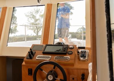 Gli allestimenti interni sono curati e con soluzioni innovative degli spazi che consentono un ottimo stivaggio e vita all’interno confortevole con due cabine con quattro posti letto più divano letto in dinette per totali sei posti letto. Ampio bagno con box doccia separata. Proponiamo allestimenti interni in ciliegio, mogano e rovere nelle varie aree interne e in pozzetto.