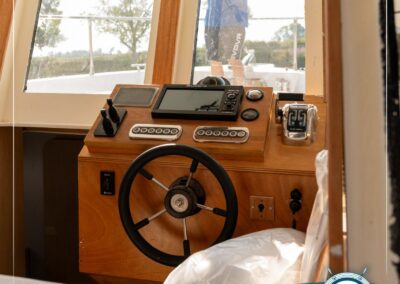 Lo scafo, realizzato in legno e vetroresina con tecnologia stripe planking, è arricchito da finiture in legni pregiati a scelta del cliente.