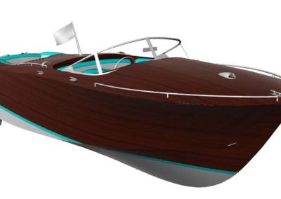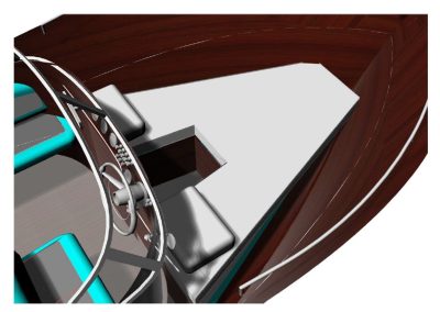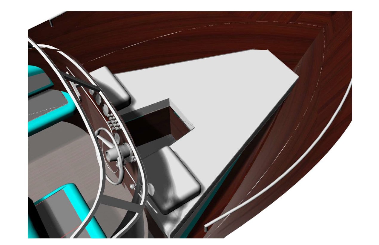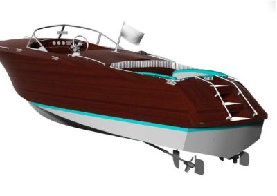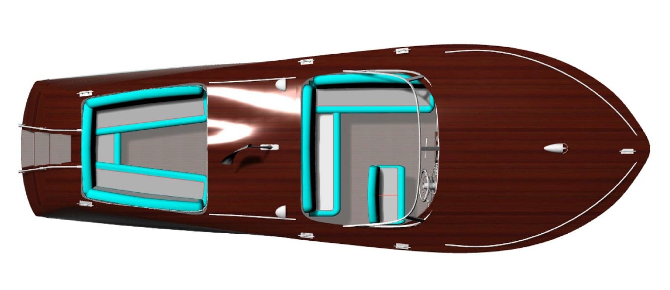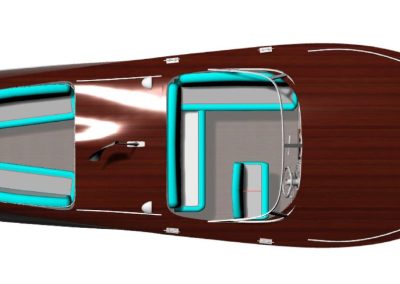 La barca presenta nel progetto proposto con un aspetto classico anni 70-80 con murate a vista in mogano o altro materiale pregiato a scelta del cliente.